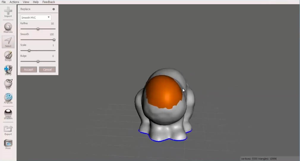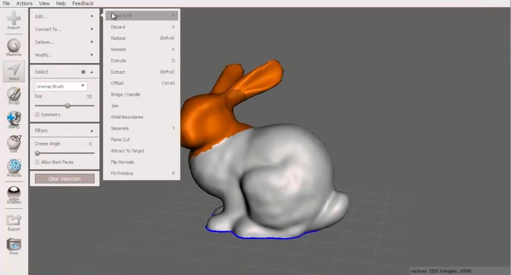 پیش از اتصال حجم به مدل سه بعدی اصلی، شاید لازم باشد که قسمتی از آن را حذف کنید. برای انجام چنین کاری باید روی تبِ «Select» کلیک کنید. قسمتی از مدل را برای حذف انتخاب نمایید و سپس آن را با استفاده از «Erase and Fill» پاک کنید. Meshmixer به طور خودکار شکل انتخاب شده را حذف می کند و در نتیجه سطحی صاف و بدون هیچ گونه بی نظمی باقی می ماند.